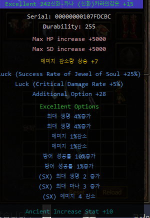 기간제 템이라서 380 옵션이나 데미지감소 노란색이 없습니다 .
