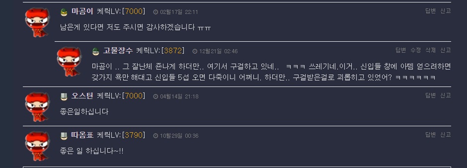 ㅋㅋㅋㅋㅋ 부끄럽겟다.. 나도 마곰이가.. 사람들 아템 후원채팅 할때  거지 취급한거 본적있는데 본인부터.. 거지구만..