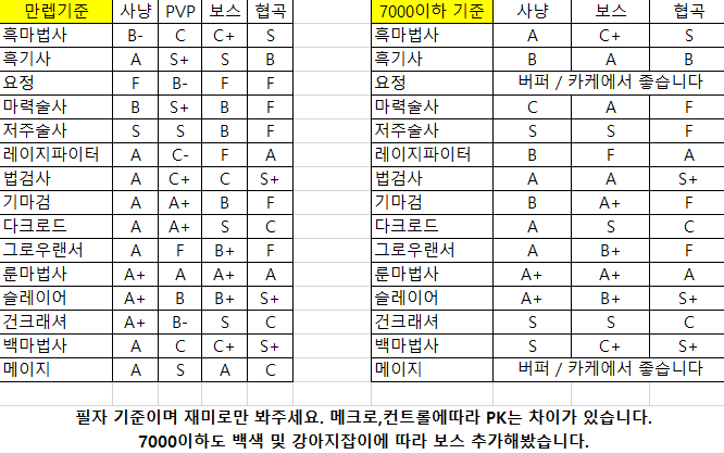 다크로드 A+로 해두엇어요~ 적어두엇다시피 재미로 보시기바랍니다 ㅎㅎ 사실 그냥 제가 재미로 만드는거지.. 하나하나 따지고 들어가면 티어 의미가없긴해요 현시점에서 기사,술사, 마검, 메이지 빼고는 단일로 쓸수잇는 케릭이없으니까요 특히나 현 다크경우 저도 하고잇지만 메이지하나 못잡는게 현실입니다.. ㅠ