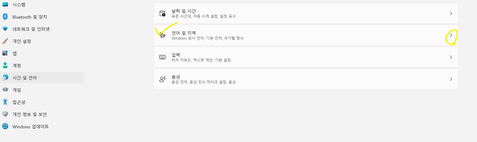 시작>설정> 시간 및 언어> 언어 및 지역(우측화살표)>한국어(우측 점3개 클릭)> 언어 옵션>